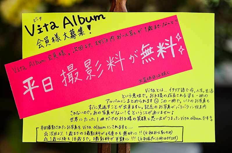 特典満載のVita Album会員を大募集中!お子様の記念行事のお写真を一冊に!撮影されたお写真をVita Albumにされますと次回スタジオ撮影料が18歳までなんと50%OFF!!さらに一才までの金曜日を除いた平日撮影スタジオ内一人写しが何度でも無料!(アルバム作成日より1年間有効)